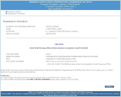 Yes yes, this is the moment that I'd wait for damn long since my STPM result. 17days to go to know which University I'm entering. =)